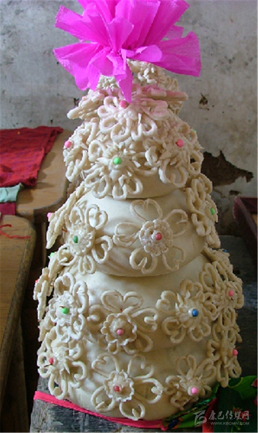 何謂“花饃饃”,顧名思義,就是用面粉做成的一種夾心并模印圖案的薄餅。一般“花饃饃”的厚度約一指厚,直徑為13厘米左右。制作“花饃饃”時,一定要用新打出的本地面粉(用新面意為喜慶豐收)并不加發(fā)酵的老面(主要防止饃饃以及饃饃上的圖案變形),只加少許蘇打以水揉面即可。餡兒是由藏族特有的食品酥油、糌粑、奶渣等拌上紅糖或白糖而成。先將揉好的面粉揉成巴掌大的面坨,把調(diào)好的心子包在面坨內(nèi),然后壓平,盡量使它變成圓形,并在“花饃饃”的最中心粘一小片青綠的蘿卜葉,然后用雕有各種圖案的印板印上圖案。印板圖案多為三條圓圈或藏族美術(shù)中常有的萬吉祥等,圈內(nèi)雕有玉兔、鹿子、獐子吉祥物等,一般是一對玉兔相對而立,或是鹿子休閑躺于青草之上,或是兩朵鮮花對開,或是……再用手將“花饃饃”的周邊勒成各種花邊,并點上幾點食用紅點(紅點表喜慶,如年內(nèi)曾遇喪事則不點紅點)。最后將成形的“花饃饃”置于平鍋底在火上烘成即可。烘好后的“花饃饃”外形呈圓形,象征圓月,“圓月”里有玉兔等吉祥圖,有象征喜慶吉祥的紅,有象征春天的綠,極為鮮麗好看而又香甜味美,叫人垂涎。但做好后不能立即實用,首先要選兩個最大最好的來敬月亮,敬菩薩,要等敬月亮,敬菩薩后,中秋這天才能吃,并伴以水果等物贈送鄰里、親朋。據(jù)說這是為了促進友誼,讓大家品嘗共享吉祥。