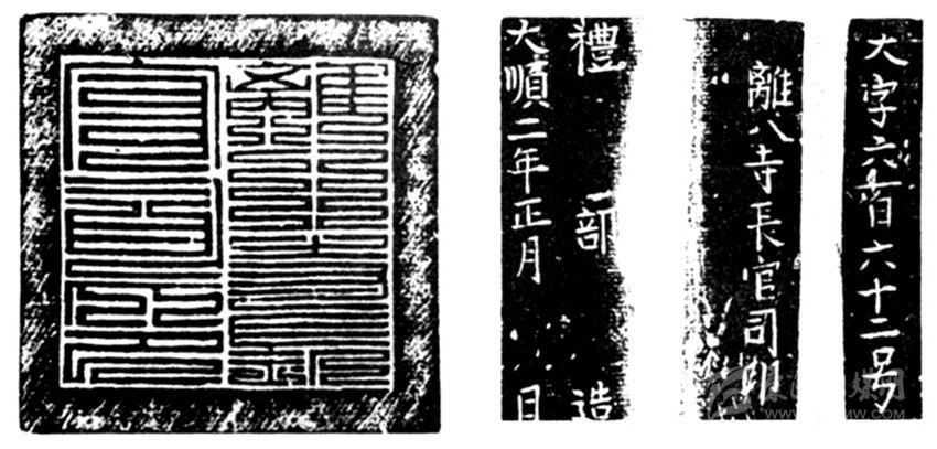 “離八寺官司印”為大西政權(quán)官印,大順二年(1645)鎏金銅制九疊篆印章。高約6CM, 規(guī)格7×7,印章正面邊款鑄文“大字六百六十二號(hào) 離八寺長官司印”,側(cè)刻“禮部造 大順二年正月 日”,評為國家一級文物。史書載:“獻(xiàn)忠遍招諸土司,用降人為誘,鑄金印赍之,以易其官?!币虼丝赏茢啵擞榇笪髡?quán)控制川西少數(shù)民族所鑄。