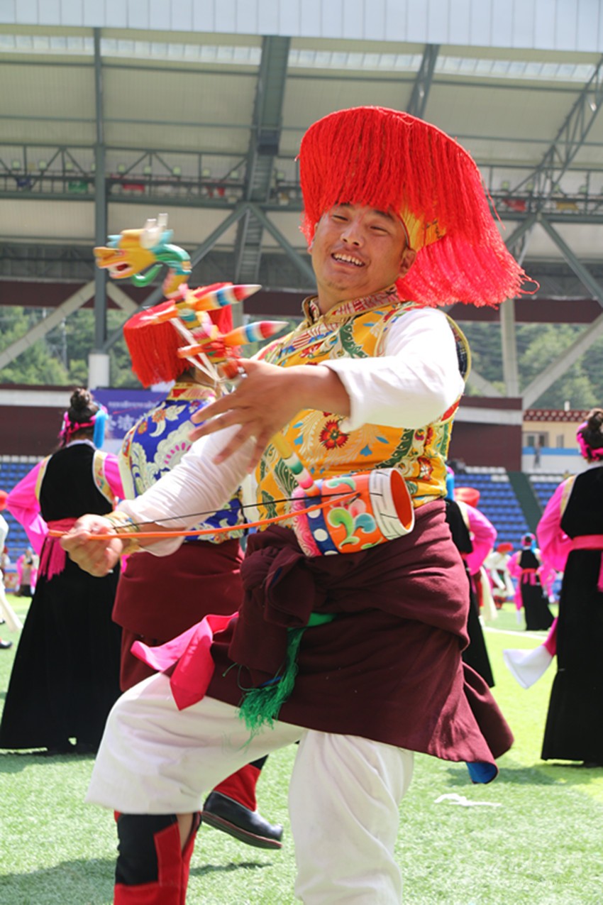 扎西腳蹬紅黑相間的藏式手工皮靴,提腿、反跨、揭回、點(diǎn)輾,系在腰間的紫紅色藏袍隨著弦律微微擺動(dòng),體態(tài)輕盈,溝壑縱橫的臉上洋溢著笑容。臺(tái)上的評(píng)委頻頻點(diǎn)頭,四周的觀(guān)眾紛紛鼓掌:“你看,扎西‘羌魯’跳得多好!‘諧本’就該是這樣!”