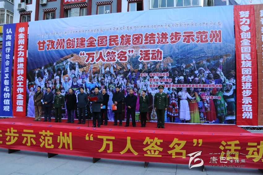 州人大常委會副主任李致民宣布創(chuàng)建全國民族團結(jié)進步示范州“萬人簽名”活動正式開始后,州領(lǐng)導(dǎo)汪洋、李致民、楊國元、范文華、蔣秀英、楊學(xué)康以及甘孜軍分區(qū)、駐州武警部隊領(lǐng)導(dǎo)同州級機關(guān)、志愿者、個體工商戶、學(xué)生、駐軍、政法干警、康定縣黨政機關(guān)干部代表近千人,陸續(xù)到“萬人簽名”條幅上簽下了自己的姓名。