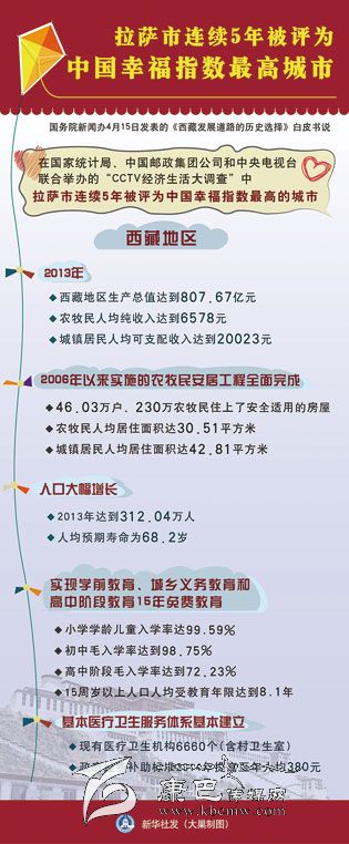 新華社北京4月15日電(記者張曉松、郭麗琨)白皮書(shū)說(shuō),西藏絕大多數(shù)人口擺脫了延續(xù)上千年的貧困,基本達(dá)到了小康生活水平。在國(guó)家統(tǒng)計(jì)局、中國(guó)郵政集團(tuán)公司和中央電視臺(tái)聯(lián)合舉辦的“CCTV經(jīng)濟(jì)生活大調(diào)查”中,拉薩市連續(xù)5年被評(píng)為中國(guó)幸福指數(shù)最高的城市。