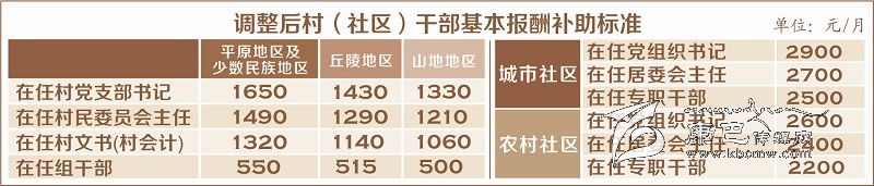 省上明確,此次村(社區(qū))干部基本報(bào)酬標(biāo)準(zhǔn)為最低補(bǔ)助標(biāo)準(zhǔn),各地可根據(jù)經(jīng)濟(jì)發(fā)展水平、城鄉(xiāng)居民收入狀況和工作需要進(jìn)行適當(dāng)增加調(diào)整,重點(diǎn)對(duì)村人口在3000人以上、高寒高海拔地區(qū)工作的提高補(bǔ)助標(biāo)準(zhǔn);對(duì)跨村兼職和兼任組干部的提高報(bào)酬待遇。各地要進(jìn)一步完善村(社區(qū))干部基本報(bào)酬激勵(lì)保障機(jī)制,繼續(xù)推行“固定報(bào)酬+績(jī)效報(bào)酬”制度,強(qiáng)化考評(píng)激勵(lì),充分調(diào)動(dòng)村(社區(qū))干部干事創(chuàng)業(yè)活力。
