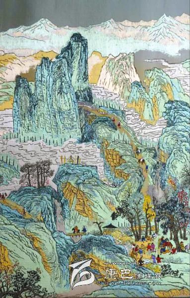 在蜀錦蜀繡展覽館中,由蜀錦大師馬德坤,蜀繡大師鄔學(xué)強(qiáng)共同創(chuàng)作大型錦繡作品《南方絲路圖》,吸引不少游客駐足。該作品天空部分的藍(lán)色由深及淺,并逐步過(guò)渡到表現(xiàn)地面的泥金色。同時(shí),利用絲織品的透光性,使遠(yuǎn)山和近景形成強(qiáng)烈對(duì)比,大大地增強(qiáng)了畫面的縱深感。