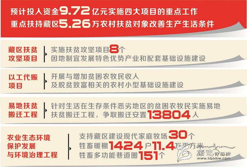 答:比如藏區(qū)扶貧攻堅(jiān)項(xiàng)目,從實(shí)施內(nèi)容來(lái)看,今年在阿壩州、甘孜州、涼山州木里縣實(shí)施扶貧攻堅(jiān)項(xiàng)目8個(gè),其中阿壩州3個(gè)、甘孜州4個(gè)、涼山州木里縣1個(gè),預(yù)計(jì)投入中央財(cái)政專(zhuān)項(xiàng)扶貧資金4000萬(wàn)元,表面上延續(xù)了去年的工作,但今年實(shí)施項(xiàng)目將突出兩大要求,一是項(xiàng)目要瞄準(zhǔn)今年有計(jì)劃摘帽的貧困村、計(jì)劃脫貧的貧困戶,集中力量解決突出問(wèn)題。二是項(xiàng)目資金要到村入戶,因地制宜發(fā)展特色優(yōu)勢(shì)產(chǎn)業(yè)和配套基礎(chǔ)設(shè)施建設(shè),確保精準(zhǔn)扶貧。