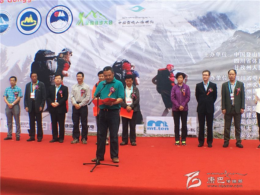 開幕式上,四川省體育局副局長(zhǎng)蔣顯倫為2016中國(guó)•甘孜環(huán)貢嘎山百公里國(guó)際山地戶外運(yùn)動(dòng)挑戰(zhàn)賽暨徒步大會(huì)作致辭。