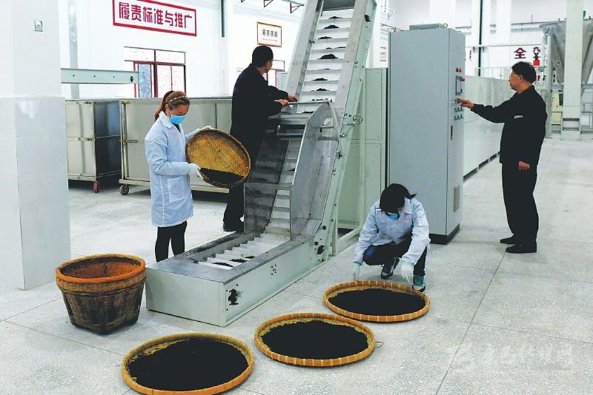 工人正在自動化生產(chǎn)線上生產(chǎn)藏茶。