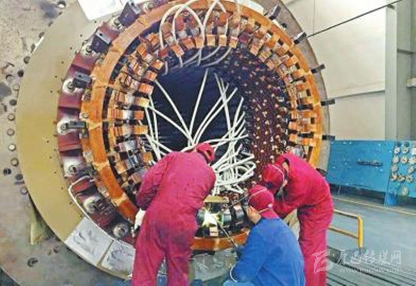 2月22日,在東方電機發(fā)電機分廠,工人們正對中煤五彩灣4號機定子進(jìn)行高工位電路焊接。 東方電氣集團東方電機有限公司供圖