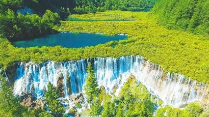 重建實(shí)踐彰顯生態(tài)理念——九寨溝景區(qū)內(nèi),尊重自然、綠色修復(fù)的舉措不勝枚舉。地震后,諾日朗瀑布出現(xiàn)一條16.8米長(zhǎng)的裂縫,僅剩一股急流。景區(qū)就地取材,用地震中垮塌的鈣化物來(lái)填補(bǔ)“漏水”的裂縫,豐水期時(shí),諾日朗瀑布恢復(fù)了昔日壯觀景象。
