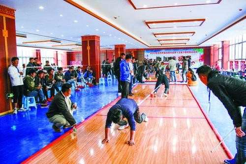 今年,我州將由115名運(yùn)動(dòng)員、教練員等組成11支運(yùn)動(dòng)隊(duì),參與賽事設(shè)置的8個(gè)競(jìng)賽項(xiàng)目和2個(gè)表演項(xiàng)目,其中有兩支隊(duì)伍將參與綜合類(lèi)表演項(xiàng)目比賽。我州總參賽人數(shù)相比上一屆略有減少。我州參加綜合類(lèi)表演項(xiàng)目比賽的節(jié)目是《瑪亞切通》和《炯動(dòng)》?!冬攣喦型ā纷g為孔雀吃水,主要體現(xiàn)力量和平衡的動(dòng)作;《炯動(dòng)》取材于藏民族農(nóng)村修建房屋時(shí)的勞動(dòng)場(chǎng)面,以青年男女在勞動(dòng)過(guò)程中載歌載舞對(duì)歌或比拼勞動(dòng)成果、質(zhì)量、進(jìn)度為內(nèi)容,主要比拼身體的力量和靈活度。我州參加競(jìng)技類(lèi)表演項(xiàng)目比賽的節(jié)目是《嘎久》。《嘎久》意為翻閱馬鞍或吉祥翻越,是藏族人民節(jié)日聚會(huì)時(shí)的一種競(jìng)技體育活動(dòng),主要比拼靈活性、趣味性和技巧性。