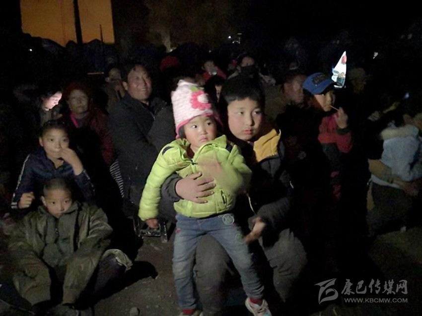夜幕降臨,四川甘孜藏族自治州巴塘縣竹巴龍鄉(xiāng)納扎西村安置點(diǎn)的百姓聚在一起看電影。(圖片由巴塘縣宣傳部提供)