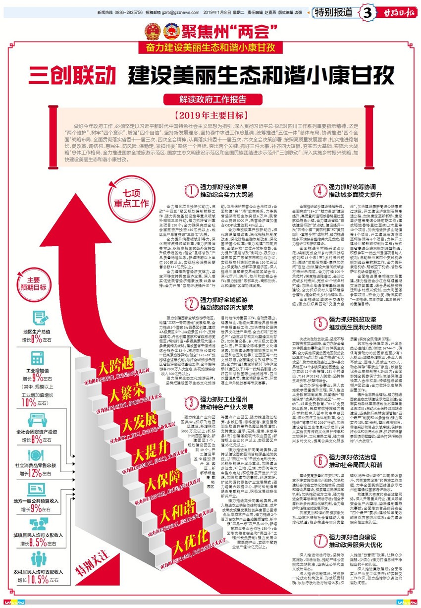 肖友才指出,今年發(fā)展形勢更加復(fù)雜、發(fā)展任務(wù)更加繁重,我們必須緊緊抓住大有可為的重要戰(zhàn)略機(jī)遇期和政策紅利“窗口期”,統(tǒng)籌兼顧、突出重點、突破難點,全力保持經(jīng)濟(jì)社會高速度與高質(zhì)量并重發(fā)展良好態(tài)勢,重點做好以下工作:一是強(qiáng)力抓好經(jīng)濟(jì)發(fā)展,推動綜合實力大跨越。堅持把項目投資作為推動高質(zhì)量發(fā)展的重中之重,全力確保完成全社會固定資產(chǎn)投資460億元以上、地區(qū)生產(chǎn)總值突破“三百億”大關(guān);深化商貿(mào)流通領(lǐng)域改革,強(qiáng)力拓展消費市場,健全“圣潔甘孜”產(chǎn)品質(zhì)量標(biāo)準(zhǔn)體系,實現(xiàn)社會消費品零售總額112億元以上;堅定不移支持民營經(jīng)濟(jì)發(fā)展,力爭民營經(jīng)濟(jì)市場主體突破6萬戶、民營企業(yè)突破8000戶,民營經(jīng)濟(jì)增加值占GDP比重達(dá)到48%以上;堅持以供給側(cè)結(jié)構(gòu)性改革為主線,強(qiáng)力推動各項改革任務(wù)落地見效。二是強(qiáng)力抓好全域旅游,推動旅游經(jīng)濟(jì)大繁榮。堅定不移實施產(chǎn)業(yè)富民戰(zhàn)略,全力推進(jìn)以全域旅游為核心的生態(tài)優(yōu)先、綠色發(fā)展,強(qiáng)力構(gòu)建“三環(huán)一帶兩濕地”發(fā)展格局,全力打造世界重要旅游目的地和國家全域旅游示范區(qū);堅持把建設(shè)國際生態(tài)文化旅游目的地作為重要工作,全力打響中國最美雪山、中國最美濕地、中國最美草原、中國最美藏寨、中國最美漢子“五張名片”,強(qiáng)力培育生態(tài)文化旅游品牌。三是強(qiáng)力抓好工業(yè)強(qiáng)州,推動特色產(chǎn)業(yè)大發(fā)展。堅定不移實施工業(yè)強(qiáng)州戰(zhàn)略,堅持“優(yōu)先發(fā)展新興產(chǎn)業(yè)、大力發(fā)展農(nóng)特加工產(chǎn)業(yè)、有序發(fā)展電礦產(chǎn)業(yè),大建園區(qū)、建大園區(qū),大建基地、建大基地,大建產(chǎn)業(yè)、建大產(chǎn)業(yè)”思路,強(qiáng)力推進(jìn)產(chǎn)業(yè)向園區(qū)集中;堅持以建設(shè)國家級清潔能源基地為統(tǒng)攬,積極穩(wěn)妥開發(fā)礦產(chǎn)資源,積極發(fā)展戰(zhàn)略性新興產(chǎn)業(yè),強(qiáng)力推進(jìn)電礦向高端集群;堅持以建設(shè)現(xiàn)代高原特色農(nóng)牧業(yè)基地為重點,深入推進(jìn)農(nóng)業(yè)供給側(cè)結(jié)構(gòu)性改革,強(qiáng)力推進(jìn)龍頭向基地集聚。四是強(qiáng)力抓好統(tǒng)籌協(xié)調(diào),推動城鄉(xiāng)面貌大提升。堅定不移實施城鄉(xiāng)提升戰(zhàn)略,堅持“七管齊下”“四態(tài)合一”的思路,做強(qiáng)縣城、做優(yōu)鄉(xiāng)鎮(zhèn)、做美村寨,全面推進(jìn)城鄉(xiāng)建設(shè)提檔升級;堅定不移實施鄉(xiāng)村振興戰(zhàn)略,編制完成全州鄉(xiāng)村振興戰(zhàn)略規(guī)劃和18個縣(市)鄉(xiāng)村振興規(guī)劃,全面推進(jìn)鄉(xiāng)村振興試點示范;堅定不移實施交通先行戰(zhàn)略,強(qiáng)力打好第四輪“交通大會戰(zhàn)”,全面推進(jìn)區(qū)域綜合交通樞紐;高標(biāo)準(zhǔn)編制災(zāi)后重建實施方案和項目清單,強(qiáng)力推進(jìn)金沙江白格堰塞湖災(zāi)后恢復(fù)重建。五是強(qiáng)力抓好脫貧攻堅,推動民生民利大保障。堅定不移實施扶貧攻堅戰(zhàn)略,堅持把脫貧攻堅作為最大的政治責(zé)任、最大的民生工程、最大的發(fā)展機(jī)遇,決戰(zhàn)決勝脫貧攻堅;深入實施教學(xué)質(zhì)量提升工程,深化醫(yī)療衛(wèi)生體制改革,完善公共文化服務(wù)體系,全力辦好社會事業(yè);堅持就業(yè)優(yōu)先,大規(guī)模開展職業(yè)技能培訓(xùn),全面實施全民參保計劃,依法保障退役軍人合法權(quán)益,持續(xù)推進(jìn)城鎮(zhèn)棚戶區(qū)改造,全力做好水電移民安置工作,筑牢社會保障體系;堅定不移實施生態(tài)文明建設(shè)戰(zhàn)略,嚴(yán)格落實“三線一單”制度,強(qiáng)力推進(jìn)國家生態(tài)文明建設(shè)示范區(qū)創(chuàng)建,提升生態(tài)民生福祉。六是強(qiáng)力抓好依法治理,推動社會局面大和諧。堅定不移實施依法治州戰(zhàn)略,深化“三區(qū)”維穩(wěn)體系和依法常態(tài)化治理,深入開展反分裂斗爭,建設(shè)更高質(zhì)量的平安甘孜;堅定不移把社會管理納入法治化軌道,鞏固更加和諧的民族宗教關(guān)系;堅定不移落實安全生產(chǎn)“黨政同責(zé)、一崗雙責(zé)、齊抓共管、失職追責(zé)”責(zé)任制,構(gòu)建更大密度的安全監(jiān)管網(wǎng)絡(luò)。七是強(qiáng)力抓好自身建設(shè),推動政務(wù)服務(wù)大優(yōu)化。堅持依憲施政、依法治政,自覺運用法治思維和法治方式推進(jìn)政府工作,堅決讓公平和正義成為常態(tài);完成新一輪政府機(jī)構(gòu)改革,形成職責(zé)明確、依法行政的政府治理體系,堅決用實干和效率贏得民心;全面落實從嚴(yán)治黨主體責(zé)任,把經(jīng)濟(jì)社會發(fā)展與黨風(fēng)廉政建設(shè)同部署、同安排、同考核,堅決把紀(jì)律和規(guī)矩挺在前面。