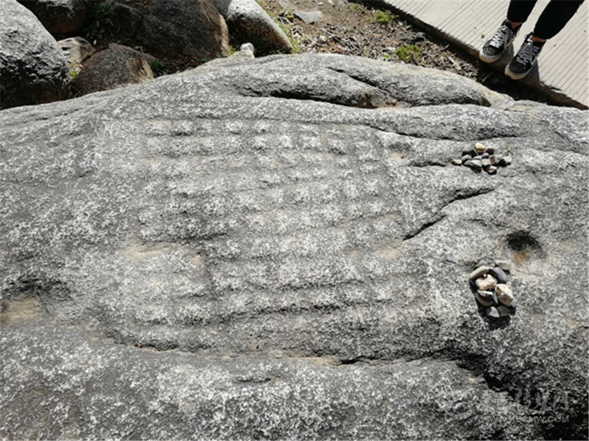 此次發(fā)現(xiàn)的唐蕃時期藏棋石刻棋盤距離甘孜縣城約30公里,沿國道317線甘孜縣向德格縣方向卡公鄉(xiāng)境內(nèi)。石刻位于公路約500米處,在1處約300余平方米、深1.6米左右的露天溫泉傍。棋盤刻在一塊重約2頓,巖面近1.5平方米花崗石表面中央,巖面整齊的刻著2.5厘米的格子,縱橫各10道線,在棋盤的左右對角兩邊,還刻有裝棋子的圓形石孔,類似于現(xiàn)今的圍棋盤。