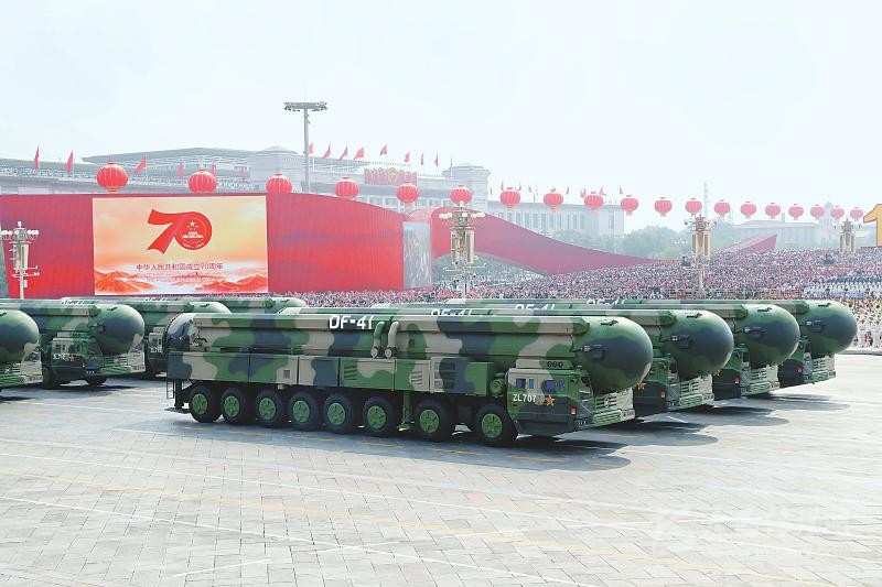 在受閱地面方隊壓軸的戰(zhàn)略打擊模塊中,首次亮相的東風-41核導(dǎo)彈方隊彰顯了我國最先進最具有威懾力大國長劍的重要地位。