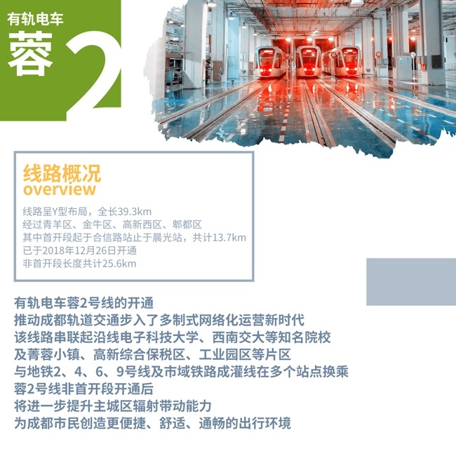 有軌電車蓉2號(hào)線工程線路呈Y型布局,線路經(jīng)過青羊區(qū)、金牛區(qū)、高新西區(qū)、郫都區(qū),線路全長39.3km。其中首開段起于合信路站,止于晨光站共計(jì)13.7km,已于2018年12月26日開通,非首開段長度共計(jì)25.6km。