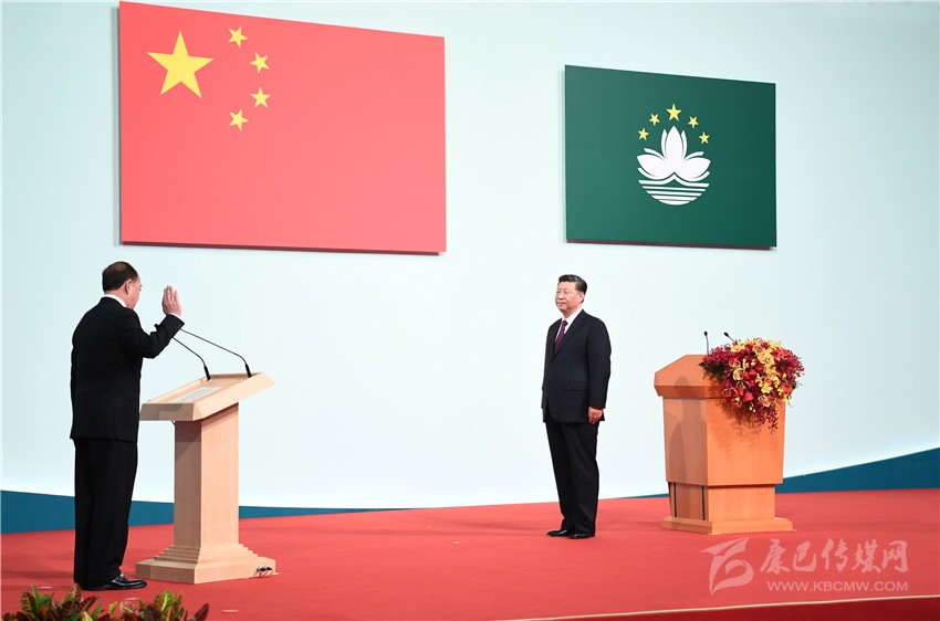 慶祝澳門回歸祖國(guó)20周年大會(huì)暨澳門特別行政區(qū)第五屆政府就職典禮20日上午在澳門東亞運(yùn)動(dòng)會(huì)體育館隆重舉行。中共中央總書記、國(guó)家主席、中央軍委主席習(xí)近平出席并發(fā)表重要講話。他指出,澳門回歸祖國(guó)20年來(lái),澳門特別行政區(qū)政府和社會(huì)各界人士同心協(xié)力,開創(chuàng)了澳門歷史上最好的發(fā)展局面,譜寫了具有澳門特色的“一國(guó)兩制”成功實(shí)踐的華彩篇章。他希望澳門特別行政區(qū)新一屆政府和社會(huì)各界人士站高望遠(yuǎn)、居安思危,守正創(chuàng)新、務(wù)實(shí)有為,在已有成就的基礎(chǔ)上推動(dòng)澳門特別行政區(qū)各項(xiàng)建設(shè)事業(yè)躍上新臺(tái)階。