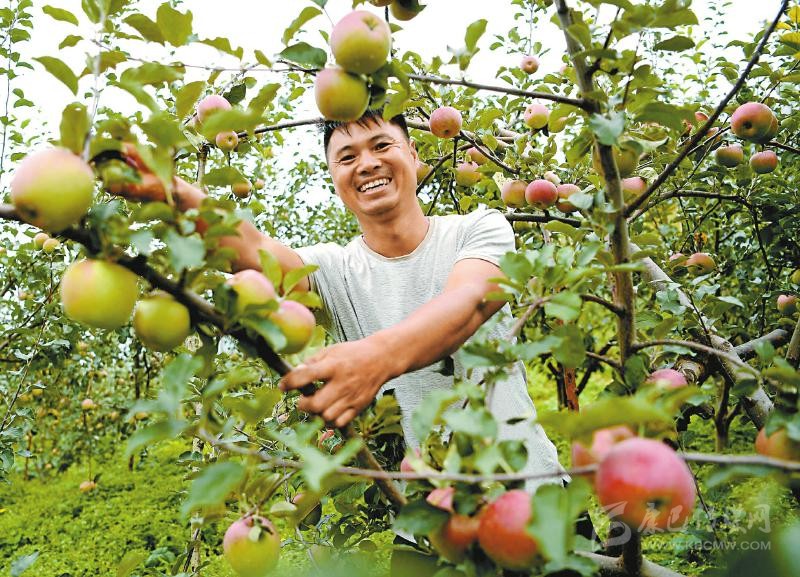 瀘定縣烹壩鎮(zhèn)固包村,致富帶頭人張雪峰正在田園采摘蘋果。