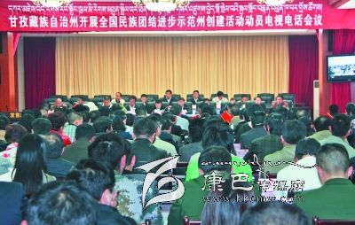 本網(wǎng)訊(記者 秦松 文/圖) 5月26日,全州開(kāi)展全國(guó)民族團(tuán)結(jié)進(jìn)步示范州創(chuàng)建活動(dòng)動(dòng)員電視電話會(huì)議在康定召開(kāi)。會(huì)議表彰了全州第四次民族團(tuán)結(jié)進(jìn)步模范集體、模范個(gè)人(戶),安排部署全國(guó)民族團(tuán)結(jié)進(jìn)步示范州創(chuàng)建工作。