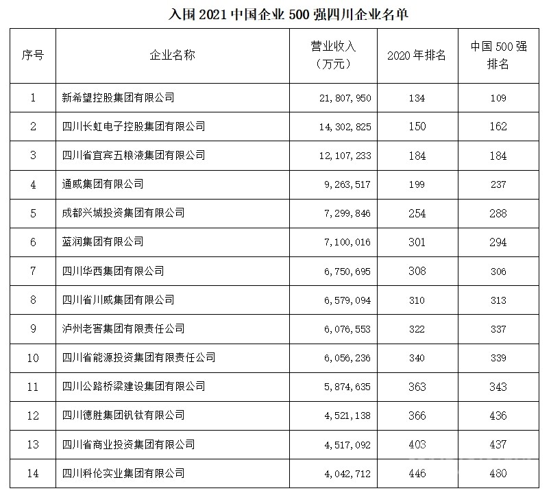 2021年四川有14家四川企業(yè)入圍中國企業(yè)500強,較上年減少1家。新希望控股集團有限公司以21,807,950萬元的營收成為進入中國500強的四川企業(yè)首位,總排名109位,比去年上升25位。其余入圍企業(yè)名單如下。