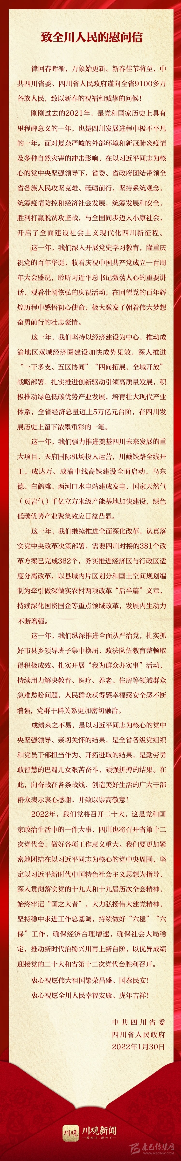 金牛辭舊歲,瑞虎迎新春。在虎年新春佳節(jié)和藏歷水虎新年來臨之際,我代表中共甘孜州委、甘孜州人民政府,向全州各族人民拜年,向老領(lǐng)導(dǎo)老同志,向駐州部隊(duì)、武警官兵、公安干警,向關(guān)心支持甘孜發(fā)展建設(shè)的各界人士,向節(jié)日期間堅(jiān)守崗位的干部職工拜年,向大家致以誠摯的問候和新春的祝福!