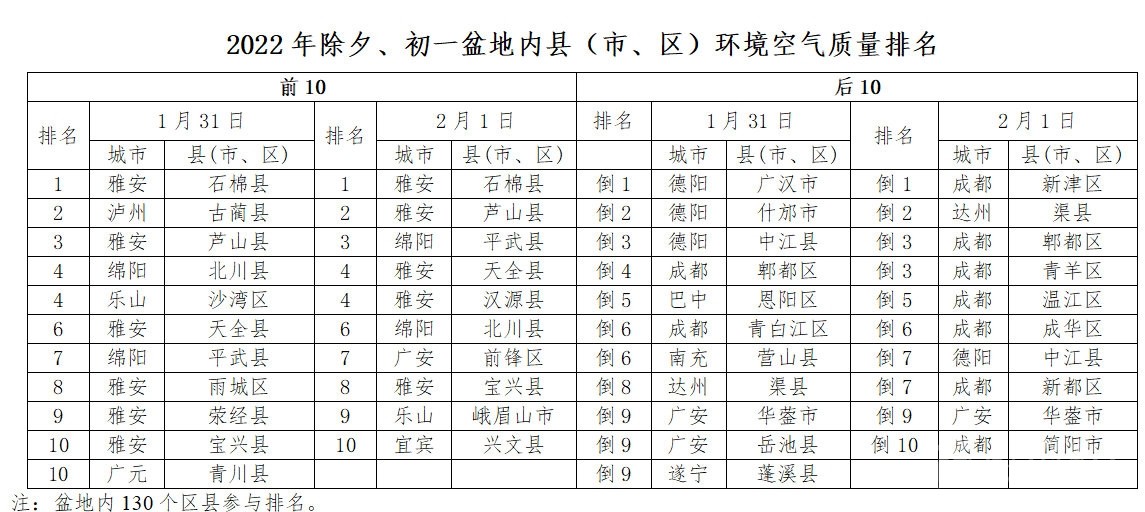 為督促各地加強煙花爆竹燃放管控,四川省生態(tài)環(huán)境廳還對盆地內(nèi)130個縣市區(qū)的空氣質(zhì)量進行了排名。