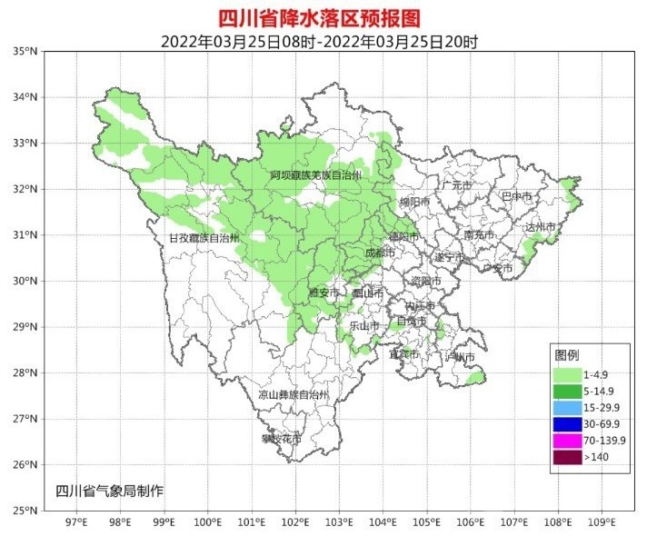 明天(3月25日)白天,盆地各市陰天轉(zhuǎn)多云,西部沿山有分散小雨;阿壩州大部、甘孜州北部東部陰天間多云有小雨(雪),甘孜州其余地方和攀西地區(qū)多云間晴。