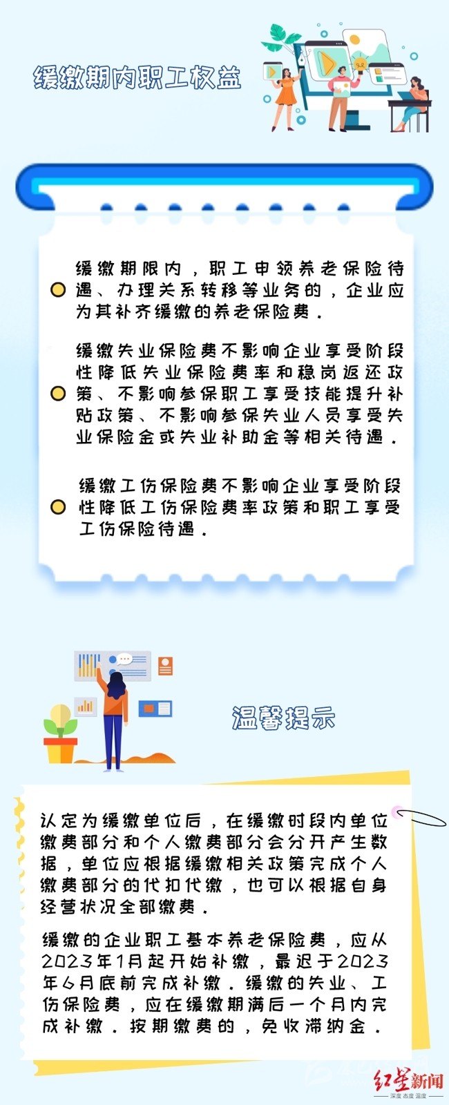 此外,為進一步加強職工權益保障,《通知》還明確,緩繳企業(yè)要依法履行代扣代繳職工個人繳費義務,不得因緩繳社會保險費,影響職工個人權益。企業(yè)原則上應在緩繳期滿后的一個月內補繳緩繳的失業(yè)保險、工傷保險費款;緩繳的企業(yè)職工基本養(yǎng)老保險費,應從2023年1月起開始補繳,最遲于2023年6月底前補繳到位,期間免收滯納金。企業(yè)可根據實際需要,提前申報繳納緩繳的費款,稅務部門應及時征收。緩繳的企業(yè)出現(xiàn)注銷等情形的,應在注銷前繳納緩繳的費款,相關部門按照注銷流程及時辦理。