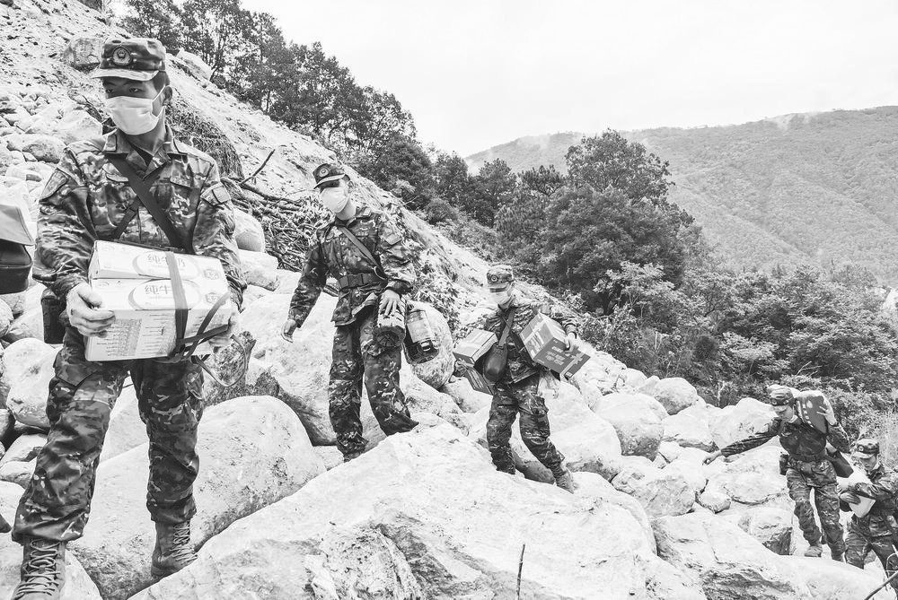 在地震發(fā)生后的48小時內(nèi),救援隊伍拼盡全力在水流湍急的河面搭設(shè)便橋,在不可能通行的地方,奮力開辟出一條生命通道,一箱箱應(yīng)急救援物資靠肩扛人背送往共和村,部分急需轉(zhuǎn)移的鄉(xiāng)親被一支支救援隊伍及時送到安全地帶,妥善安置。