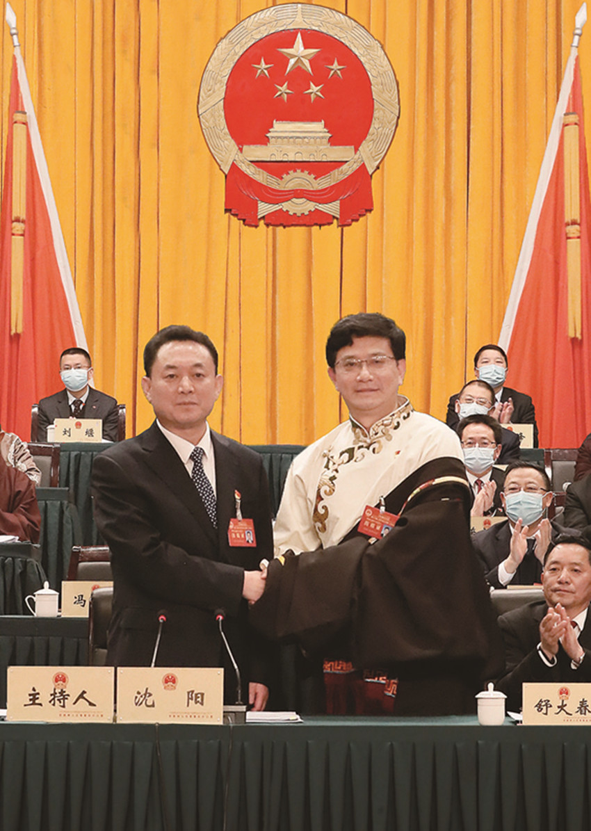 州十三屆人大一次會議上,州委書記沈陽向當(dāng)選的州人民政府州長馮發(fā)貴表示祝賀。