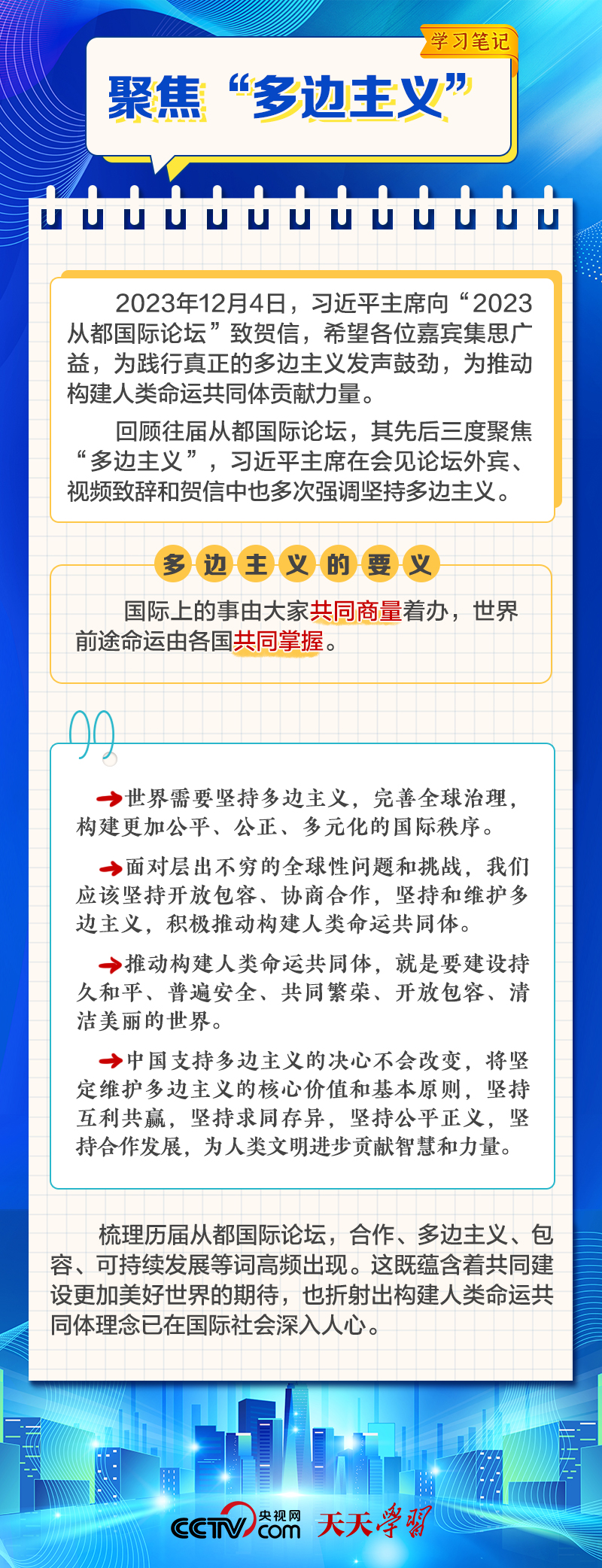 天天學(xué)習(xí)12月4日,習(xí)近平主席在致“2023從都國際論壇”的賀信中強(qiáng)調(diào),面對(duì)前所未有的世界之變、時(shí)代之變和歷史之變,人類社會(huì)必須團(tuán)結(jié)起來,堅(jiān)持互學(xué)互鑒、開放包容、合作共贏,弘揚(yáng)全人類共同價(jià)值,共同建設(shè)更加美好的世界。