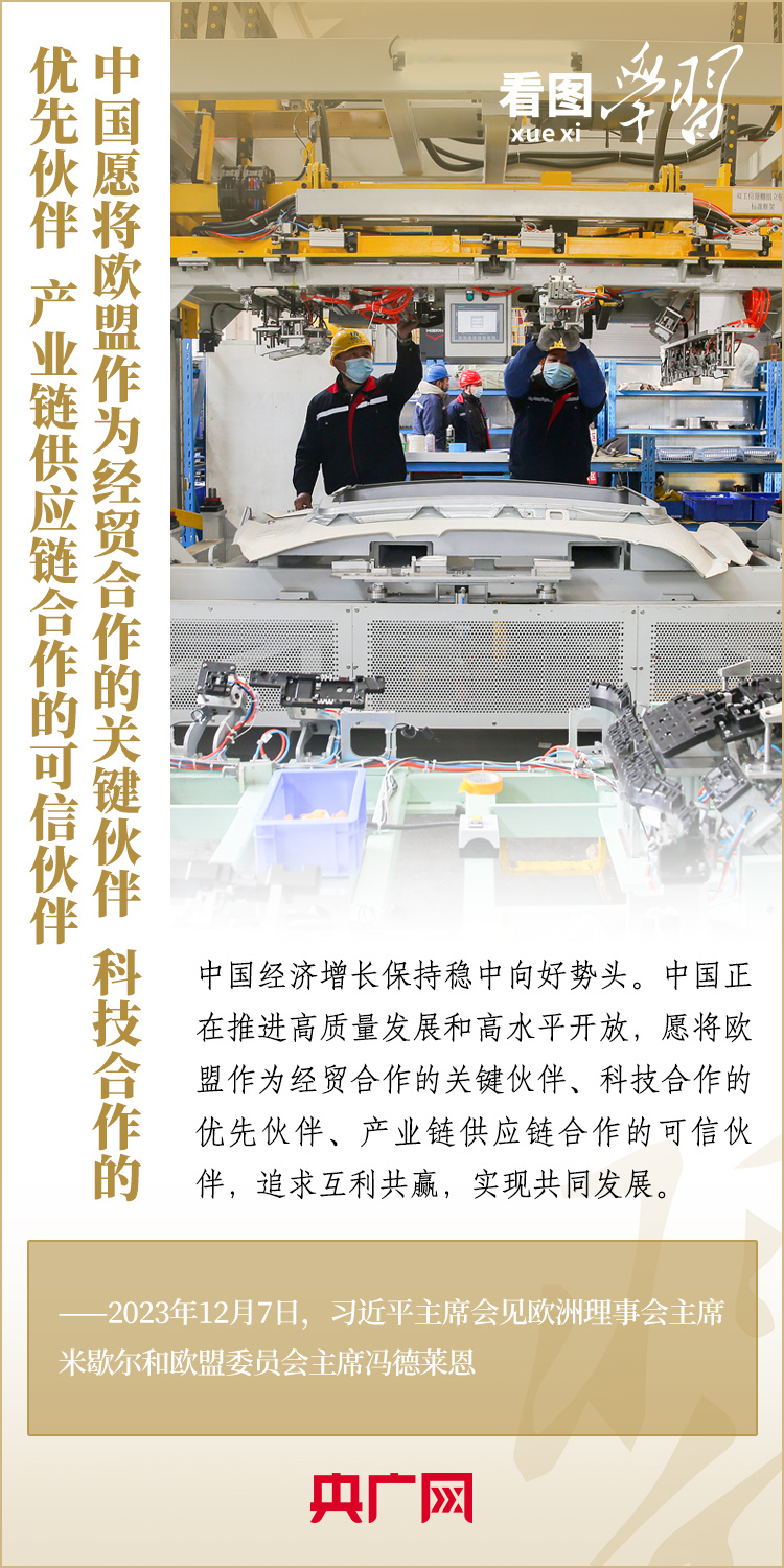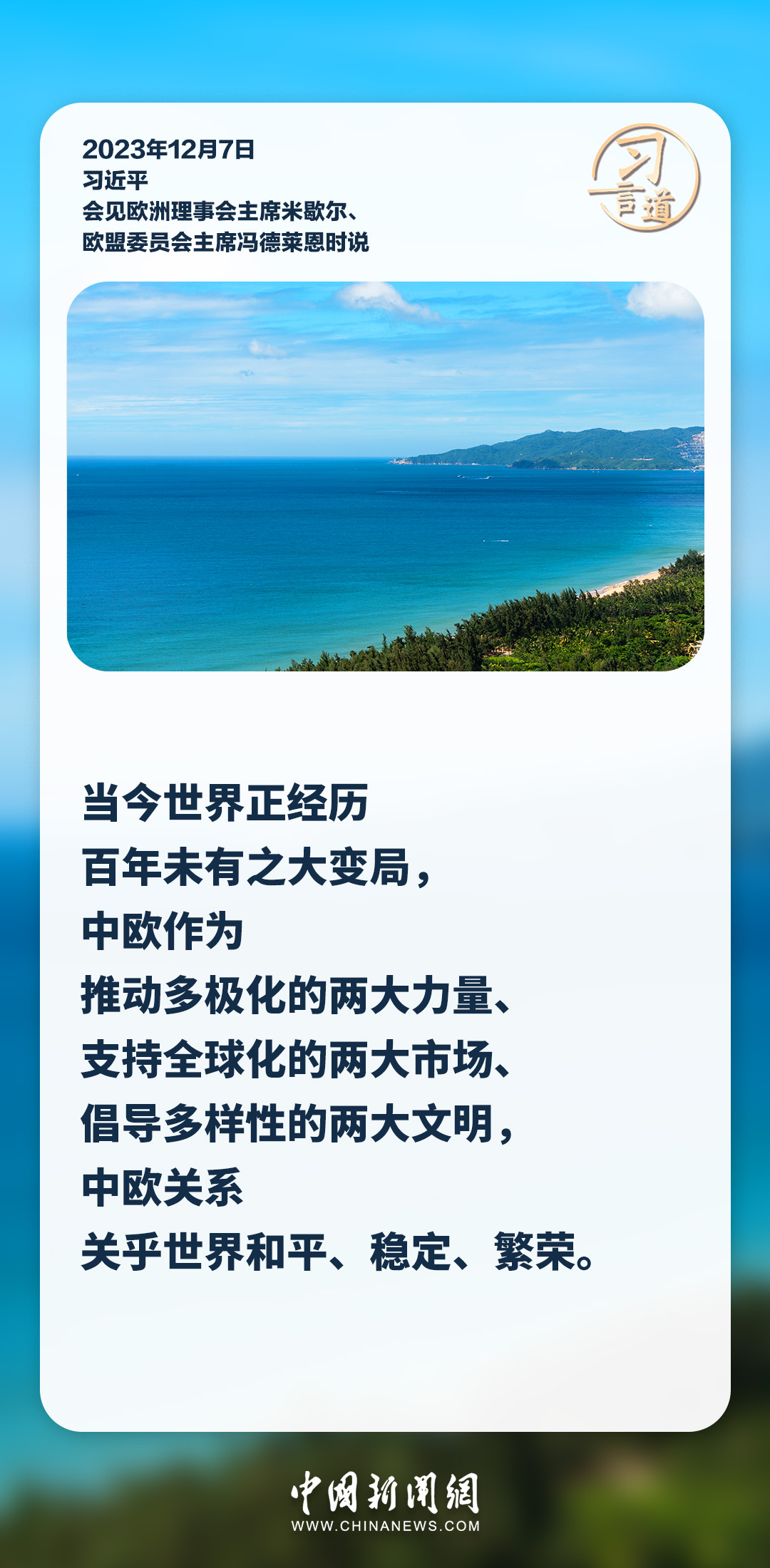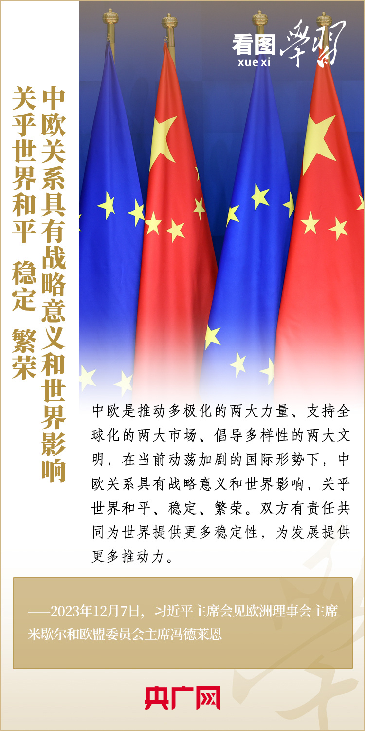12月7日,國家主席習(xí)近平會(huì)見來華舉行第二十四次中國—?dú)W盟領(lǐng)導(dǎo)人會(huì)晤的歐洲理事會(huì)主席米歇爾和歐盟委員會(huì)主席馮德萊恩,雙方就事關(guān)中歐關(guān)系的戰(zhàn)略性問題,以及中歐各領(lǐng)域?qū)υ捄献鳌㈦p方重點(diǎn)關(guān)切、全球治理、國際和地區(qū)熱點(diǎn)問題等深入坦誠交換看法,并就一系列問題達(dá)成重要共識(shí)。今年是中歐建立全面戰(zhàn)略伙伴關(guān)系20周年,習(xí)主席強(qiáng)調(diào),中歐關(guān)系具有戰(zhàn)略意義和世界影響,關(guān)乎世界和平、穩(wěn)定、繁榮。一起來學(xué)習(xí)!