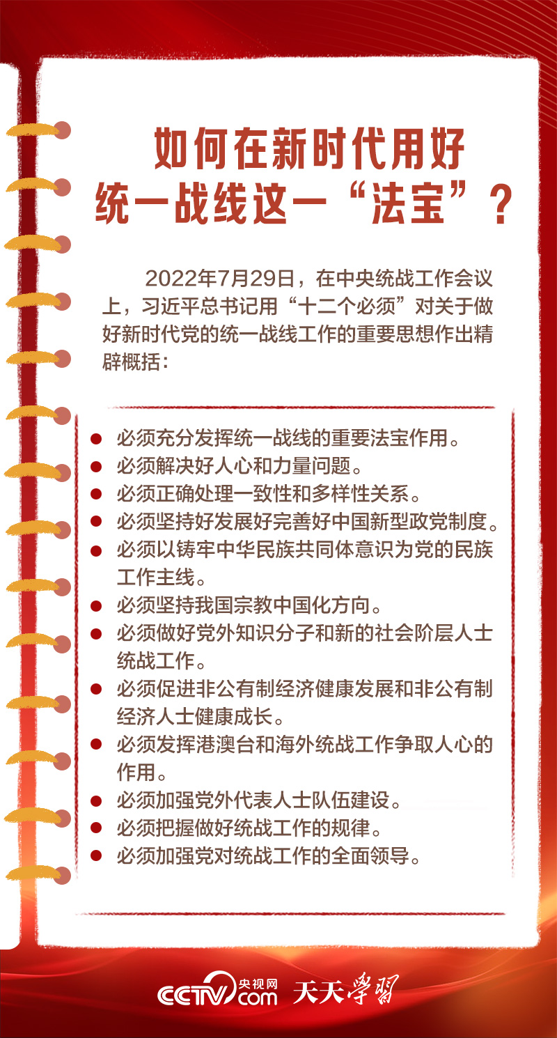 天天學習1月16日出版的第2期《求是》雜志發(fā)表了習近平總書記的重要文章《完整、準確、全面貫徹落實關(guān)于做好新時代黨的統(tǒng)一戰(zhàn)線工作的重要思想》,該文是習近平總書記2022年7月在中央統(tǒng)戰(zhàn)工作會議上講話的一部分。文章指出,統(tǒng)一戰(zhàn)線是黨克敵制勝、執(zhí)政興國的重要法寶,是團結(jié)海內(nèi)外全體中華兒女實現(xiàn)中華民族偉大復興的重要法寶,必須長期堅持。