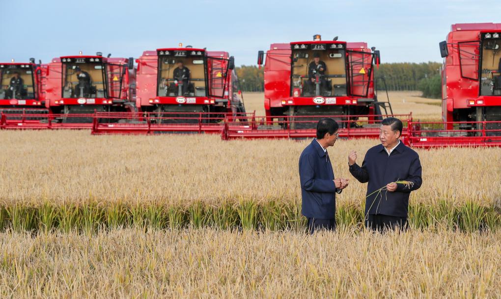 2018年9月25日,金秋時(shí)節(jié),稻浪滾滾,黑龍江農(nóng)墾建三江管理局七星農(nóng)場(chǎng)萬(wàn)畝大地號(hào)豐收在望。習(xí)近平總書記走進(jìn)正在收割的地塊,拿著稻穗,同工作人員交談,詳細(xì)了解糧食生產(chǎn)和收獲情況。