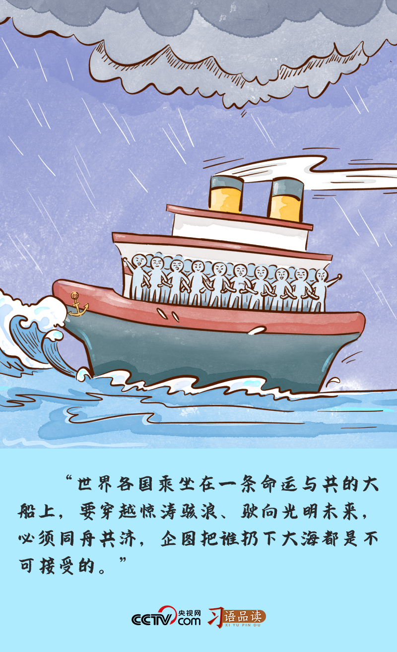 2022年1月17日,在2022年世界經(jīng)濟(jì)論壇視頻會(huì)議上,習(xí)主席深刻闡釋“小船”和“大船”的關(guān)系:“各國(guó)不是乘坐在190多條小船上,而是乘坐在一條命運(yùn)與共的大船上。小船經(jīng)不起風(fēng)浪,巨艦才能頂住驚濤駭浪。”