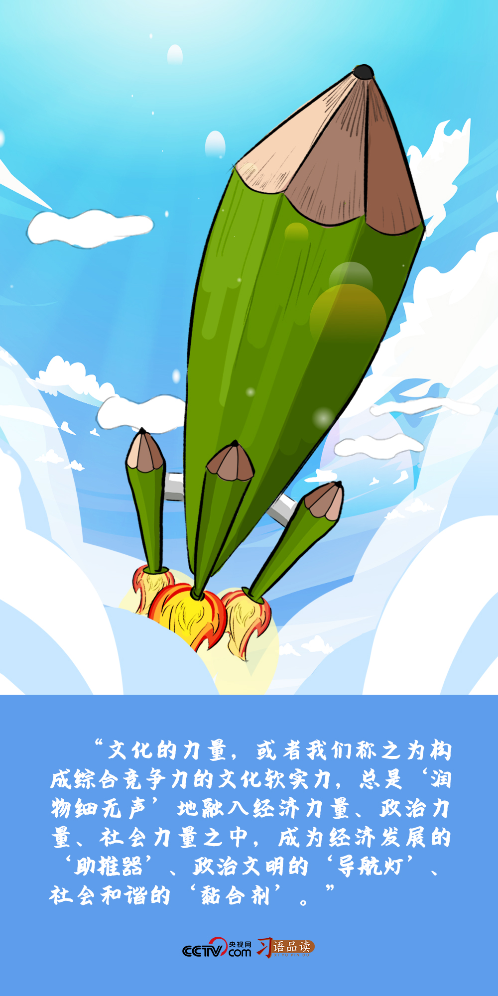 習近平用“助推器”“導航燈”“黏合劑”來打比方,闡述文化力量與經(jīng)濟力量、政治力量、社會力量交融互動、融合發(fā)展的關系,形象地解析其在經(jīng)濟發(fā)展、政治文明、社會和諧等方面所起到的重要作用。