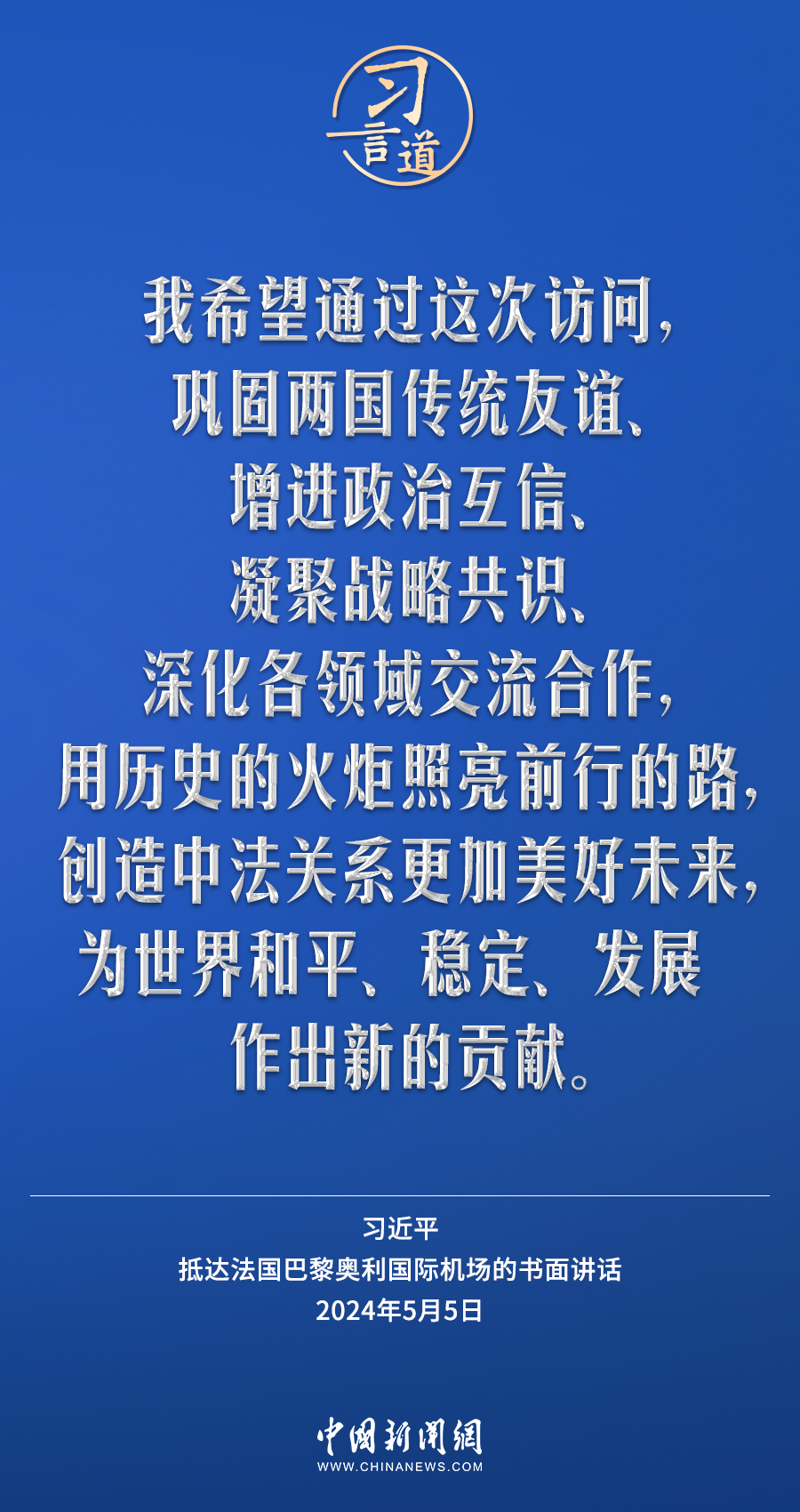 當(dāng)?shù)貢r(shí)間5月5日下午,國(guó)家主席習(xí)近平抵達(dá)巴黎,開(kāi)始對(duì)法國(guó)進(jìn)行國(guó)事訪問(wèn)。在抵達(dá)法國(guó)巴黎奧利國(guó)際機(jī)場(chǎng)的書(shū)面講話中,習(xí)近平指出——