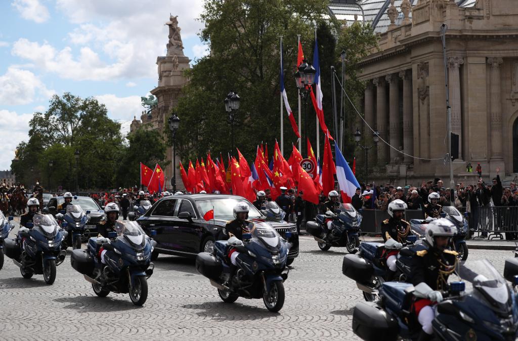 ??歡迎儀式后,習(xí)近平和夫人彭麗媛在共和國(guó)衛(wèi)隊(duì)148名騎兵組成的禮兵馬隊(duì)和摩托車(chē)隊(duì)護(hù)衛(wèi)下,乘車(chē)前往愛(ài)麗舍宮。