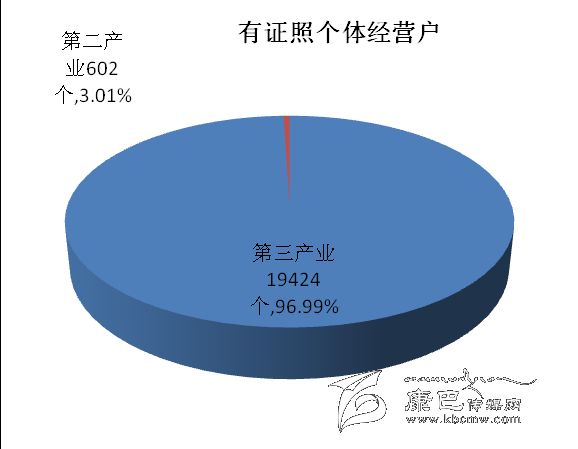 在有證照個體經營戶中,第二產業(yè)占3.01 %;第三產業(yè)占96.99 %。有證照個體經營戶從業(yè)人員中,第二產業(yè)占3.82 %,第三產業(yè)占96.18 %。