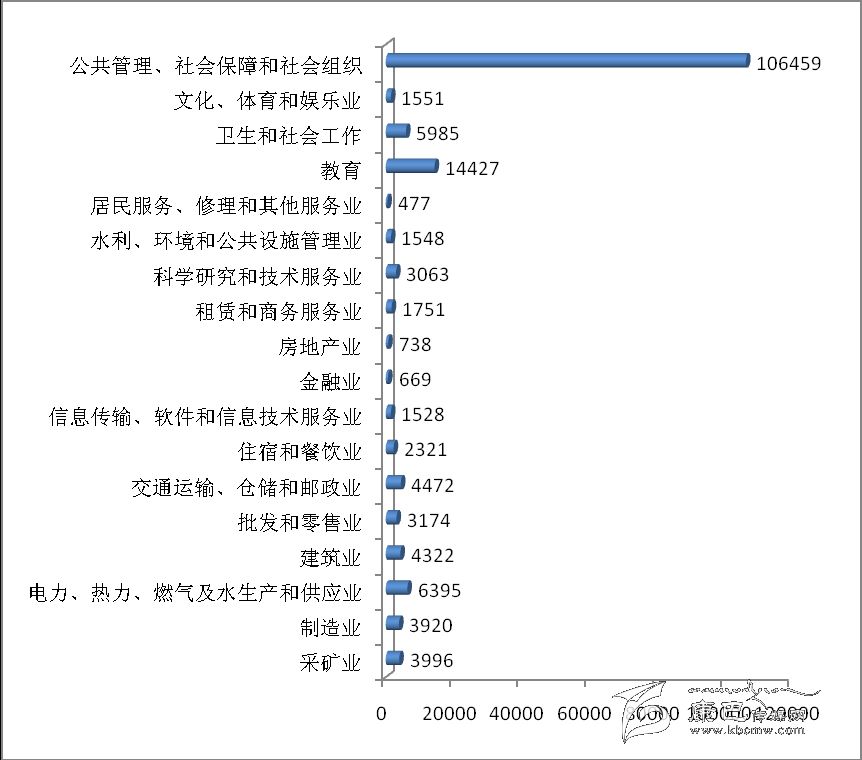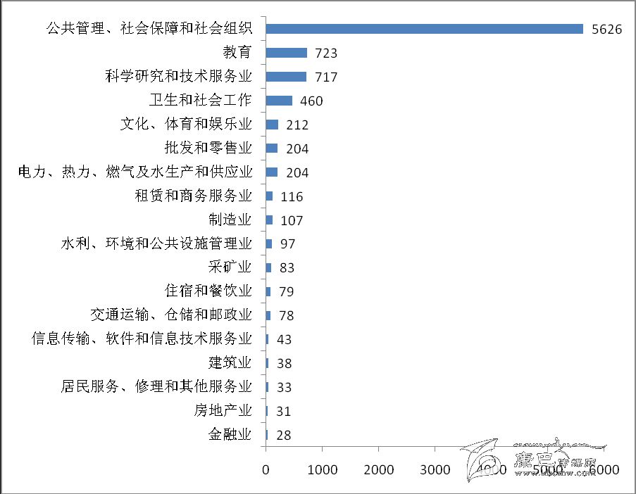 2013年末,在第二產業(yè)和第三產業(yè)法人單位中,位居前三位的行業(yè)是:公共管理、社會保障和社會組織 5626 個,占62.87 %;教育723個,占8.08 %;科學研究和技術服務業(yè)717個,占8.01 %。在有證照個體經營戶中,位居前三位的行業(yè)是:批發(fā)和零售業(yè)8349個,占41.69 %;交通運輸、倉儲和郵政業(yè)6462個,占32.27 %;住宿和餐飲業(yè)3102個,占 15.49 %(詳見表1-2)。