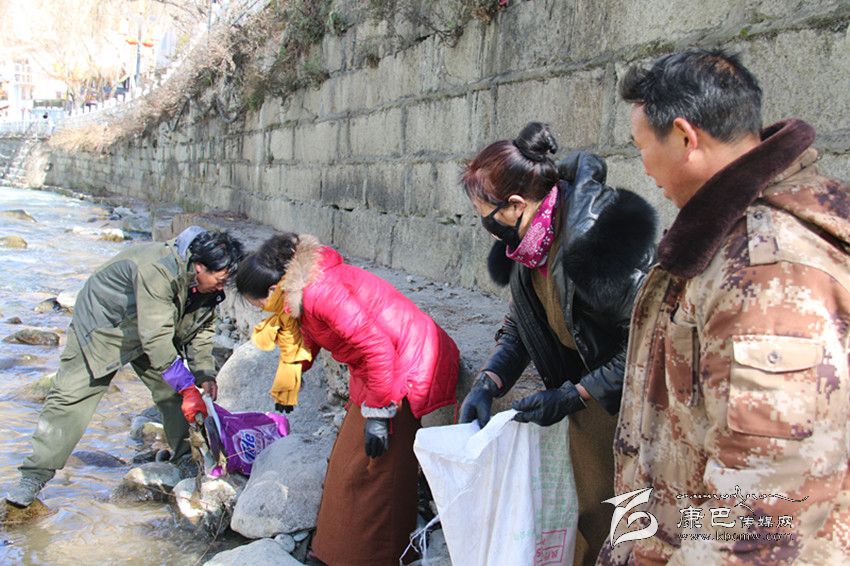 冬季的折多河水流量少,河水較淺,河道邊有許多地方都裸露出來。記者看見,有兩男兩女腳穿水靴踩在河邊正在撿拾樹枝、菜葉、白色塑料袋等雜物,其中一個男子雙手都攥滿了爛菜葉,其余三個人手里也都拎著一個滿滿的編織袋。記者上前和那名手攥爛菜葉的男子進(jìn)行交談,得知他們并不是拾荒者,而是康定市市政管理局專門負(fù)責(zé)清理河道衛(wèi)生的清潔工。