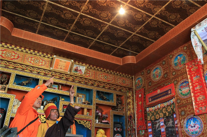 格吉大爺今年70歲了,他的孫子貢嘎是一名藏畫家,主要靠給鄉(xiāng)鄰的新房畫壁畫為生。他和哥哥兩人自學成才,鄉(xiāng)里很多人家屋內那些精美絕倫的壁畫就出自他們兩兄弟之手。“以前電不好時,天黑就無法工作,現(xiàn)在有電了,晚上都能畫,曾經要畫1個多月的壁畫,現(xiàn)在20多天就能完成。如今電好了,電話信號也比以前強,好多理塘縣城的朋友都打電話請我去給他們家里畫,這樣又能多掙些錢。”貢嘎的話語里透著對未來的幸福生活憧憬。