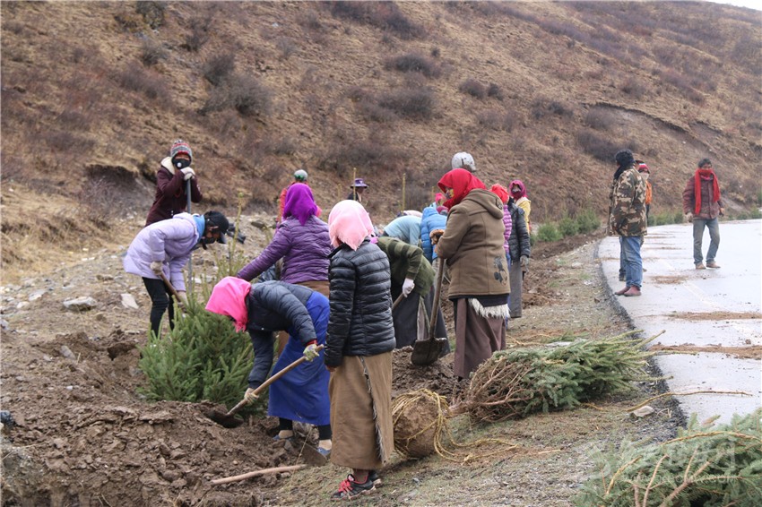 圖為甘孜縣群眾正在國道317線旁植景觀樹。