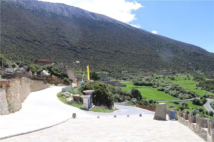 從觀(guān)景平臺(tái)向村子進(jìn)發(fā),一棟棟用石塊砌成的藏房次第映入眼簾,每一棟藏房都有獨(dú)立的院落,院墻上是堆放整齊的木柴,墻邊是造型別致的花臺(tái),有的房頂上還掛著五星紅旗。走到村口,黑化通村路變成了硬化聯(lián)戶(hù)路,道路寬敞整潔,路旁有太陽(yáng)能路燈、電子監(jiān)控、綠化花草和公共廁所;村中央的廣場(chǎng)上聚滿(mǎn)了人,他們有的是外來(lái)游客、有的是當(dāng)?shù)卮迕?,有的在曬著太?yáng)閑聊,有的在對(duì)著美景拍照。在村里,記者還發(fā)現(xiàn)有幾個(gè)小賣(mài)部、不少私家車(chē)和好幾大片長(zhǎng)勢(shì)良好的菜地,地里有一些人在勞作。