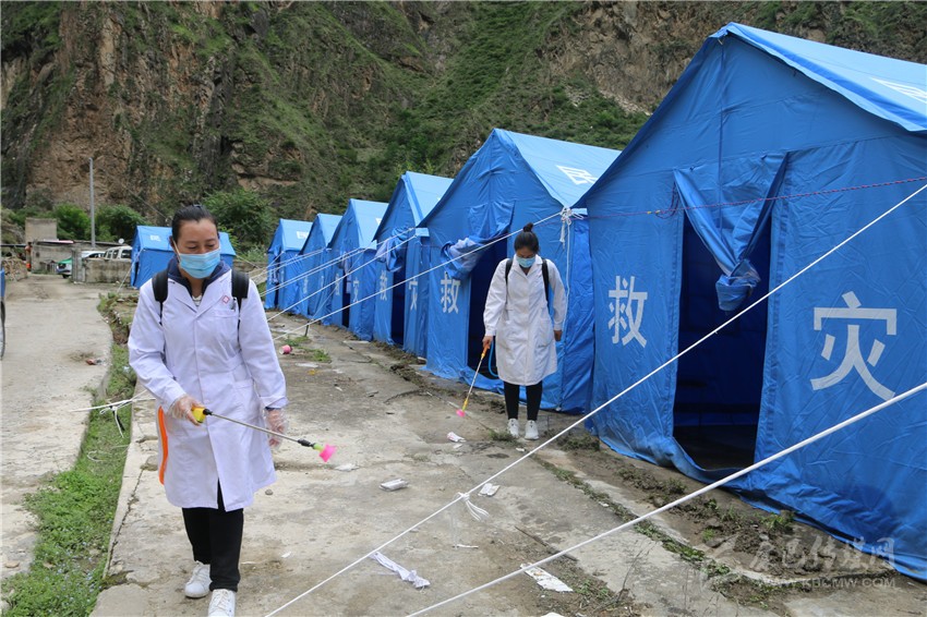 丹巴縣衛(wèi)生系統(tǒng)工作人員在臨時安置點開展消殺工作。
