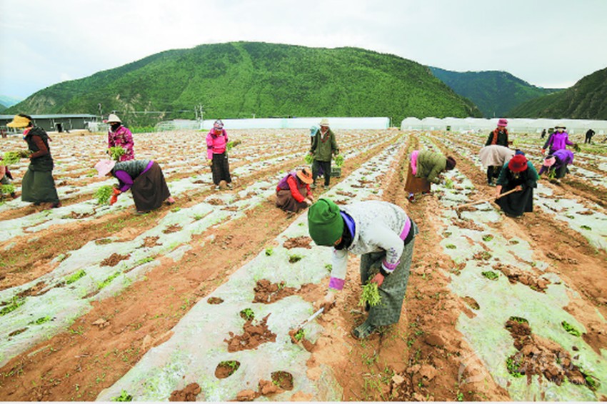 圖為農牧民在千畝有機蔬菜、藥材種植示范基地務工。 楊成龍 攝