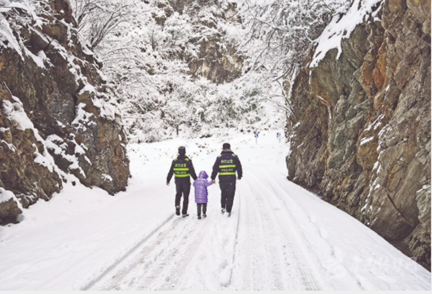 晨間,山谷滿是積雪,氣溫已降至零下??吹巾旓L(fēng)冒雪如期而至的民警,原本又驚又怕的受困游客看到了希望。柯金貴和戰(zhàn)友們一方面安撫他們,另一方面合力將事故車輛移開,并帶領(lǐng)受困人員安全離開事發(fā)區(qū)域。