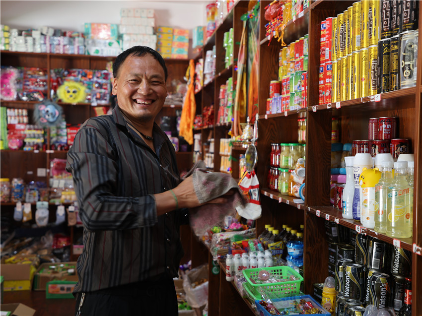 一大早,村民彭措就開始忙里忙外的收拾著小超市和茶樓,掃地、拖地、擦拭商品……每一個環(huán)節(jié)他都做得一絲不茍,他所打理的這個小超市和茶樓是村里的集體經(jīng)濟之一,每個季度都由村民們輪流負責日常經(jīng)營。這個不大的村子共有4個組67戶327人,每個季度從四個組中安排三戶村民負責村集體經(jīng)濟的運營。