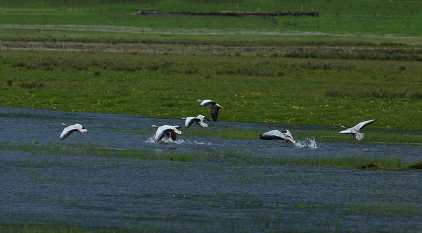 斑頭雁在白玉縣藍松湖上“飛舞”。 風(fēng)語 攝