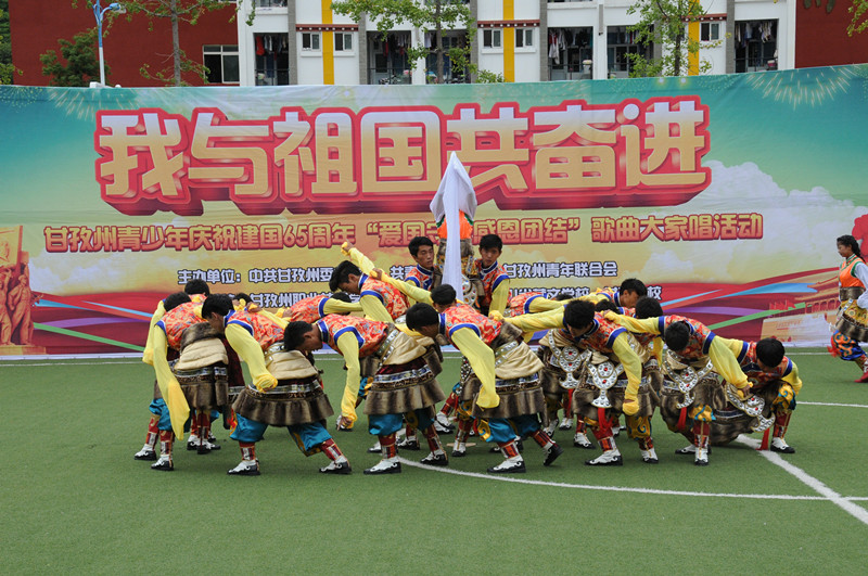 活動(dòng)中,同學(xué)們先后演唱了《黃河頌》、《我愛您,中國(guó)!》、《夢(mèng)圓中國(guó)》等多首紅色經(jīng)典歌曲。你方唱罷我登場(chǎng),現(xiàn)場(chǎng)氣氛熱烈,高潮迭起。優(yōu)美的歌聲唱出了我青少年的愛國(guó)情懷,一面面飄揚(yáng)的紅旗表達(dá)著對(duì)祖國(guó)的深情祝福。來(lái)自州職業(yè)技術(shù)學(xué)校、四川民族學(xué)院、省藏校、甘孜衛(wèi)校、州青聯(lián)委員以及我州著名歌手共1000多人放聲高歌,共同慶祝新中國(guó)成立65周年華誕。