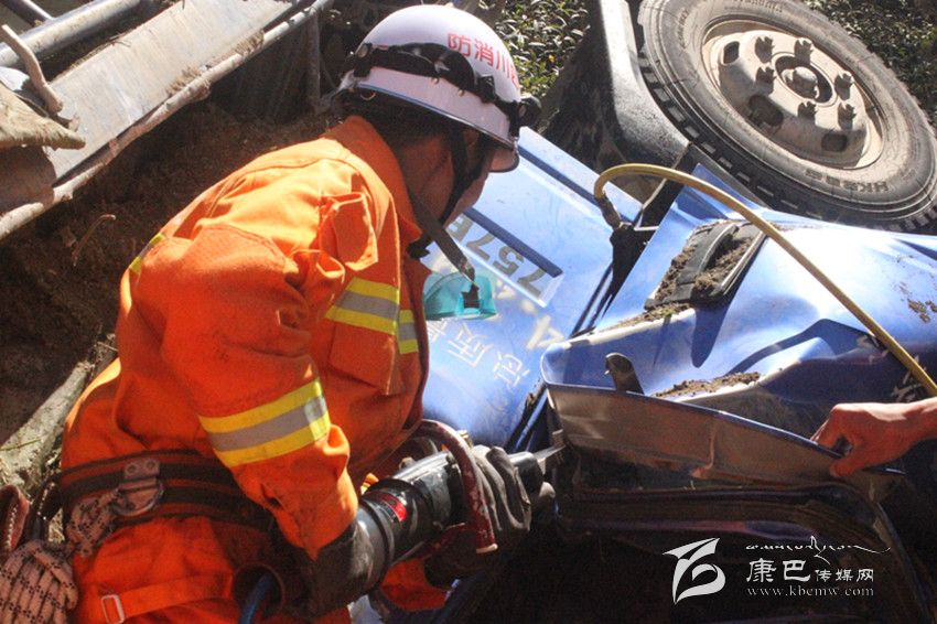 接警后,支隊(duì)指揮中心賡即調(diào)集1臺(tái)搶險(xiǎn)救援車和8名消防官兵火速趕往事發(fā)現(xiàn)場(chǎng),實(shí)施救援。10時(shí)43分左右,消防官兵抵達(dá)事發(fā)現(xiàn)場(chǎng)。經(jīng)現(xiàn)場(chǎng)調(diào)查,了解側(cè)翻卡車是因剎車失靈發(fā)生事故,車頭被嚴(yán)重?cái)D壓變形,駕駛室中有一名被困人員被卡住無法動(dòng)彈。現(xiàn)場(chǎng)情況十分緊急,指揮員立即組織安全員對(duì)事故現(xiàn)場(chǎng)安置警戒帶、警戒標(biāo)識(shí);破拆小組利用液壓擴(kuò)張剪斷器等救援器械對(duì)車內(nèi)被困人員實(shí)施破拆救援。20分鐘后,在消防官兵的努力下,受困人員被成功救出。