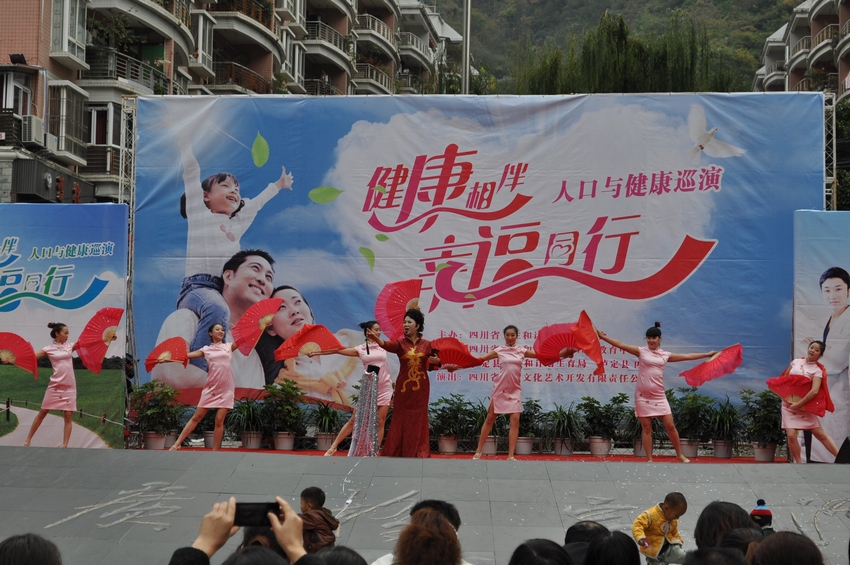 舞臺(tái)上“健康相伴•幸福同行”大型演出背景格外醒目,由省虹宇藝術(shù)團(tuán)自編自演的舞蹈《歌舞青春》、金錢板《怪哪個(gè)》、小品《你生不生》、四川清音《分級(jí)診療就是好》、雜技《烏依人》、戲曲《天府奇葩》等節(jié)目陸續(xù)登場(chǎng)。演員們通過(guò)戲曲、歌曲等形式,向廣大觀眾傳播衛(wèi)生計(jì)生新政策,臺(tái)下各縣屬醫(yī)療衛(wèi)生計(jì)生機(jī)構(gòu)醫(yī)務(wù)人員免費(fèi)開展義診活動(dòng),為廣大群眾查血壓、詢問(wèn)病史、咨詢等忙個(gè)不停,群眾與演員互動(dòng)場(chǎng)面感人。演出活動(dòng)取得良好的教育效果,得到廣大群眾的熱烈歡迎。